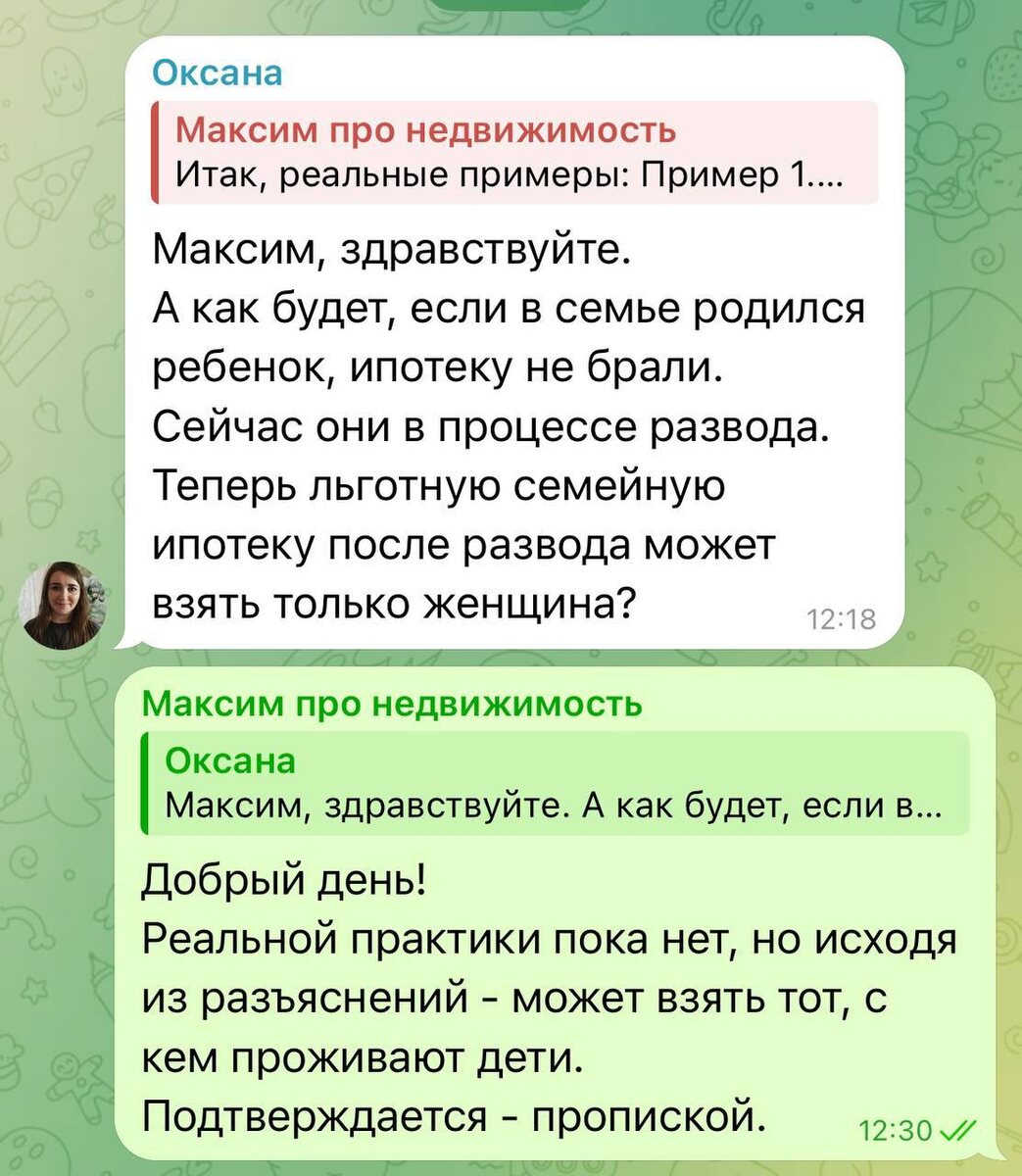 Подробно условия я уже разбирал в предыдущем посте, а сейчас отдельно отвечу на частый вопрос: ❓ Что с семейной ипотекой, если родители в разводе? Если семья распалась, право на семейную ипотеку имеет только тот родитель, который проживает с детьми. 🔹 Ключевой момент — совместная регистрация (прописка) родителя и детей. 🔹 Родитель, который с детьми не проживает и не зарегистрирован вместе с ними, право на участие в программе теряет. ⸻ 📌 Подводим итог Для получения семейной ипотеки: • дети, подходящие под условия программы, должны быть зарегистрированы по месту регистрации родителя-заёмщика; • при подаче заявки, с высокой вероятностью, потребуют: • СНИЛС ребёнка; • справку о регистрации или скан паспорта с отметкой о прописке ребёнка. ⸻ Если ситуация нестандартная (разные регистрации, планируется переезд, развод в процессе) — лучше разбирать заранее, до подачи заявки, чтобы не получить отказ.