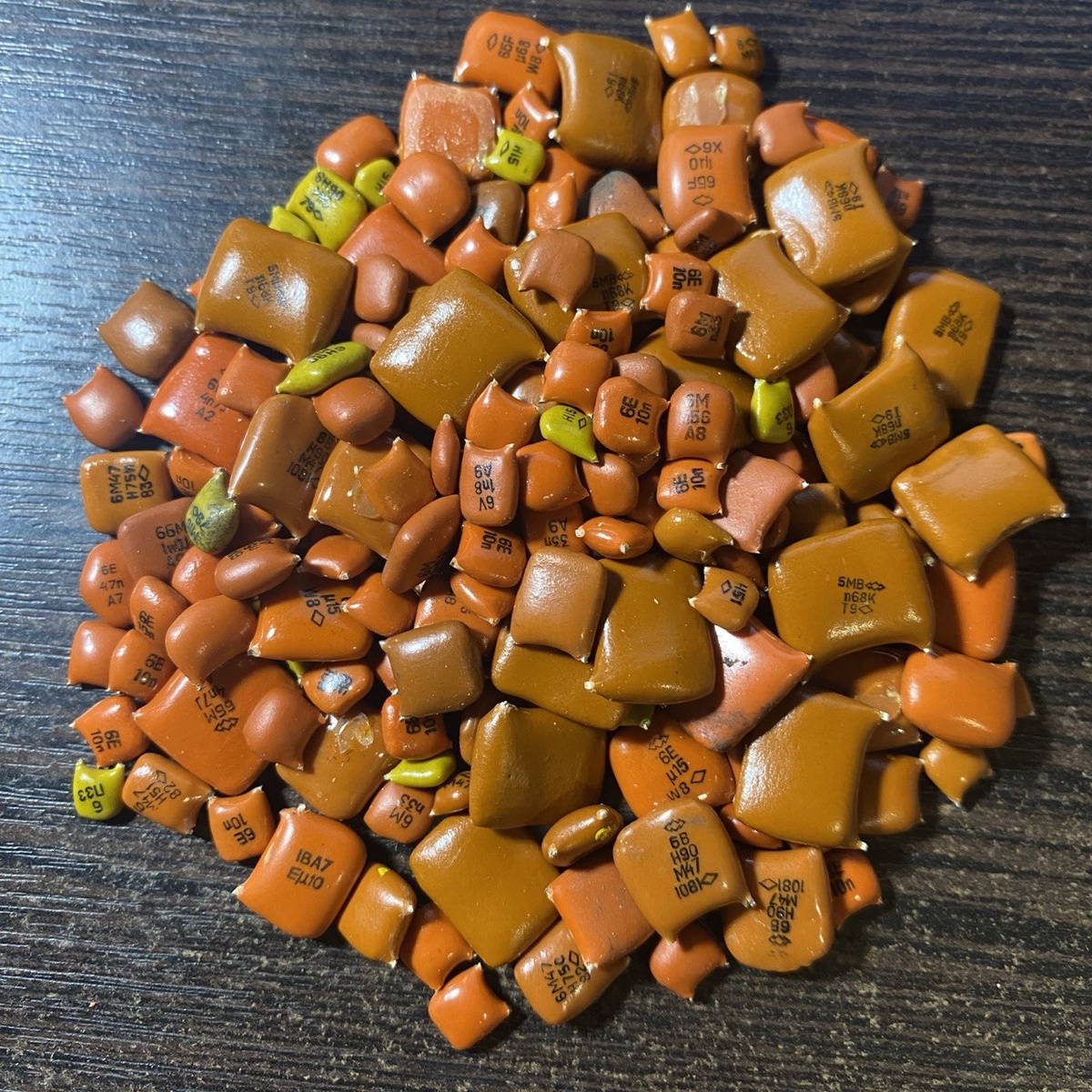 Вы разбираете старый цветной телевизор, осциллограф или промышленный блок питания – и в коробке скапливаются сотни маленьких керамических конденсаторов. При приеме мы не редко видим, что клиенты складывают их в одну кучу. Но правильно отсортированные конденсаторы КМ могут принести больше. Разбираем, какие самые дорогие конденсаторы КМ и где их можно найти. Конденсаторы типа КМ (керамические монолитные) содержат в электродах палладий, серебро и платину – драгоценные металлы, цена на которые растет год от года. Цвет корпуса – не декоративный элемент, а технологический маркер, напрямую коррелирующий с содержанием этих металлов. Больше всего ценятся зеленые и оранжевые КМ. Но цвет сам по себе не гарантирует высокую цену. Ключевое правило скупки – цвет + маркировка + размер = реальная стоимость. Один и тот же зеленый корпус с маркировкой «D» будет стоить на 20% дешевле аналога группы Н30. 1️⃣ Зеленые КМ группы Н30 (68n, 68nM, 68Н). Цвет: насыщенный зеленый. Размер: крупный (8×12 мм), квадра
