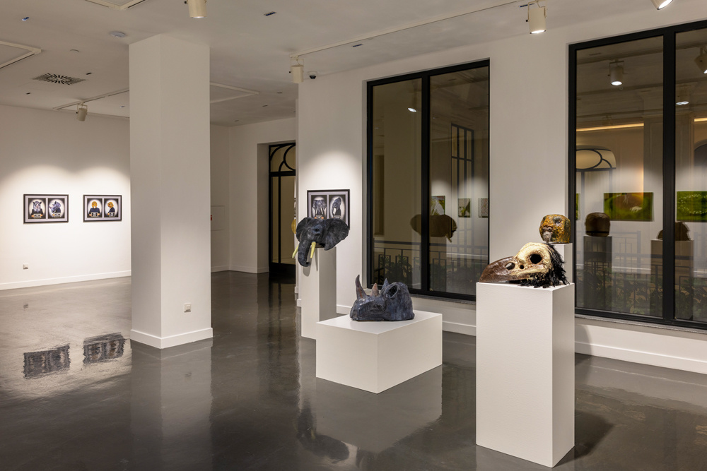 По-своему мощно встраиваются в концепцию выставки работы Сабины Джафар. Обращаясь к теме утраты взаимосвязи человека и природы, художница выходит в трехмерное пространство, населяя его пугающими инсталляциями. Скульптурные маски находящихся под угрозой исчезновения животных и птиц – азиатского слона, суматранского носорога, ворона, птицы какапо – соседствуют с фотографиями. На стенах развешаны «магшоты» – опознавательные снимки преступников, применяемые в криминалистике: люди в масках животных на фоне масштабной шкалы. Эти синкретические существа держат в руках таблички с именами-названиями. Что последует за невосполнимым исчезновением животных? Исчезновение самой природы, людей, жизни на Земле. Человек несет ответственность за планету и всех тех, кто ее населяет.