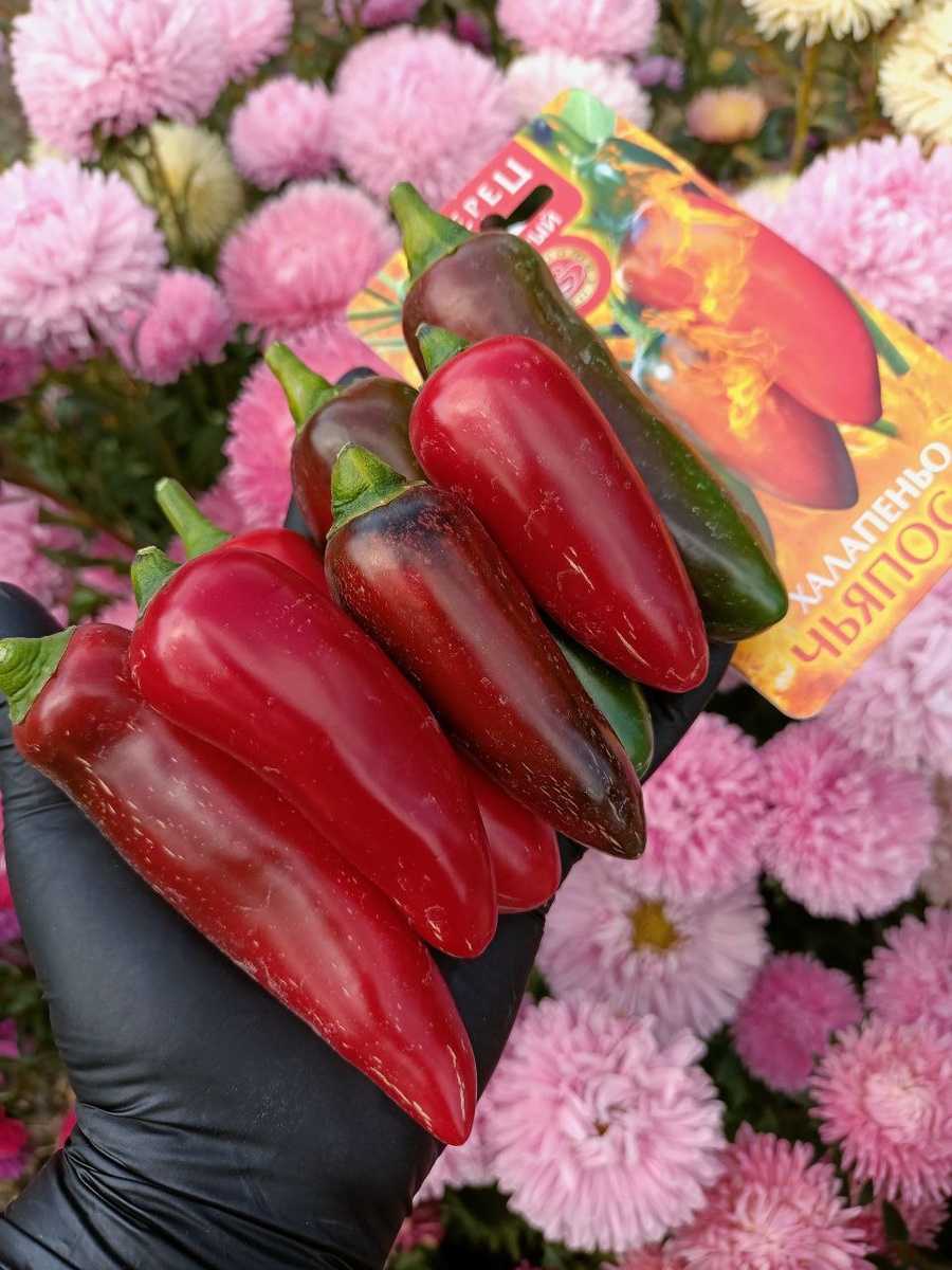 Если вы любите острый перец, обязательно присмотритесь к Халапеньо Чьяпос. В отличие от классического мексиканского халапеньо с небольшими жгучими плодами, Чьяпос формирует мощный, раскидистый куст, буквально увешанный крупными, глянцевыми перцами. 🌶️ Плоды — конусовидные, длиной 8–10 см, диаметром 4–5 см, с толстой сочной стенкой 4–5 мм. В технической спелости — насыщенно тёмно-зелёные, в биологической — глубокого красного цвета, очень эффектные и глянцевые. 🔥Острота — около 6000 единиц по шкале Сковилла «тёплая» острота, которая раскрывается волнами, без першения, кашля и ощущения «перцового баллончика». Даже при разрезании целого плода — никакого дискомфорта. Назначение универсальное: Чьяпос очень хорош в кулинарных экспериментах В пачке 5 семян — этого достаточно, чтобы закрыть все кулинарные потребности и пор