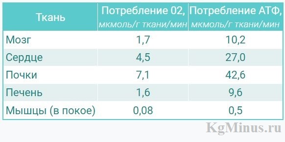Скорость потребления кислорода и АТФ в некоторых тканях: