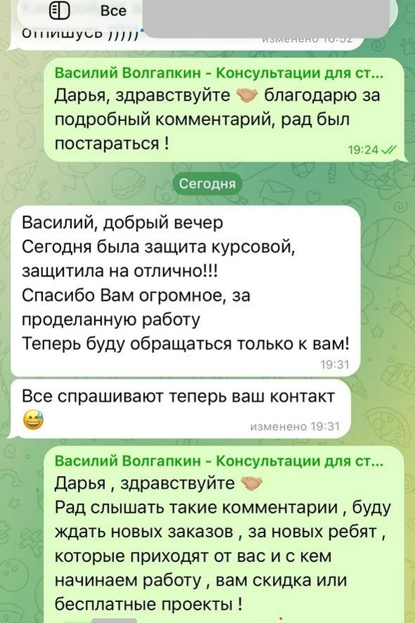 Существует два типа защиты любой научной работы: 1️⃣Когда студент сидит на защите с дрожащими руками и мандражирует 😬 2️⃣ Когда спокойно выходит со своим проектом - потому что уверен и в нем, и в себе. 😎 И вот сегодняшний кейс - как раз про второй вариант. 👇 Девушка пришла с запросом на курсовую работу. Сразу обозначила все требования, рекомендации и прочие необходимые моменты. Обожаю, когда так - чётко, структурно, по делу. Почаще бы! 🥰 Сдали с клиенткой каждую часть работы с первого раза, без корректировок и правок. 👌 После защиты студентка написала сама - для меня это особенно ценно, когда я не прошу вас оставить отзыв, но вы все равно возвращаетесь с обратной связью. 🔔 Считаю этот момент очень показательным. Защита прошла на отлично! 💯 Это тот случай, когда результат предсказуемый и очень приятный. 💬"Все спрашивают теперь ваш контакт" - а это, пожалуй, один из главных показателей качества моей работы. Когда тебя рекомендуют и заинтересовываются как специалистом. 😎 В чем се