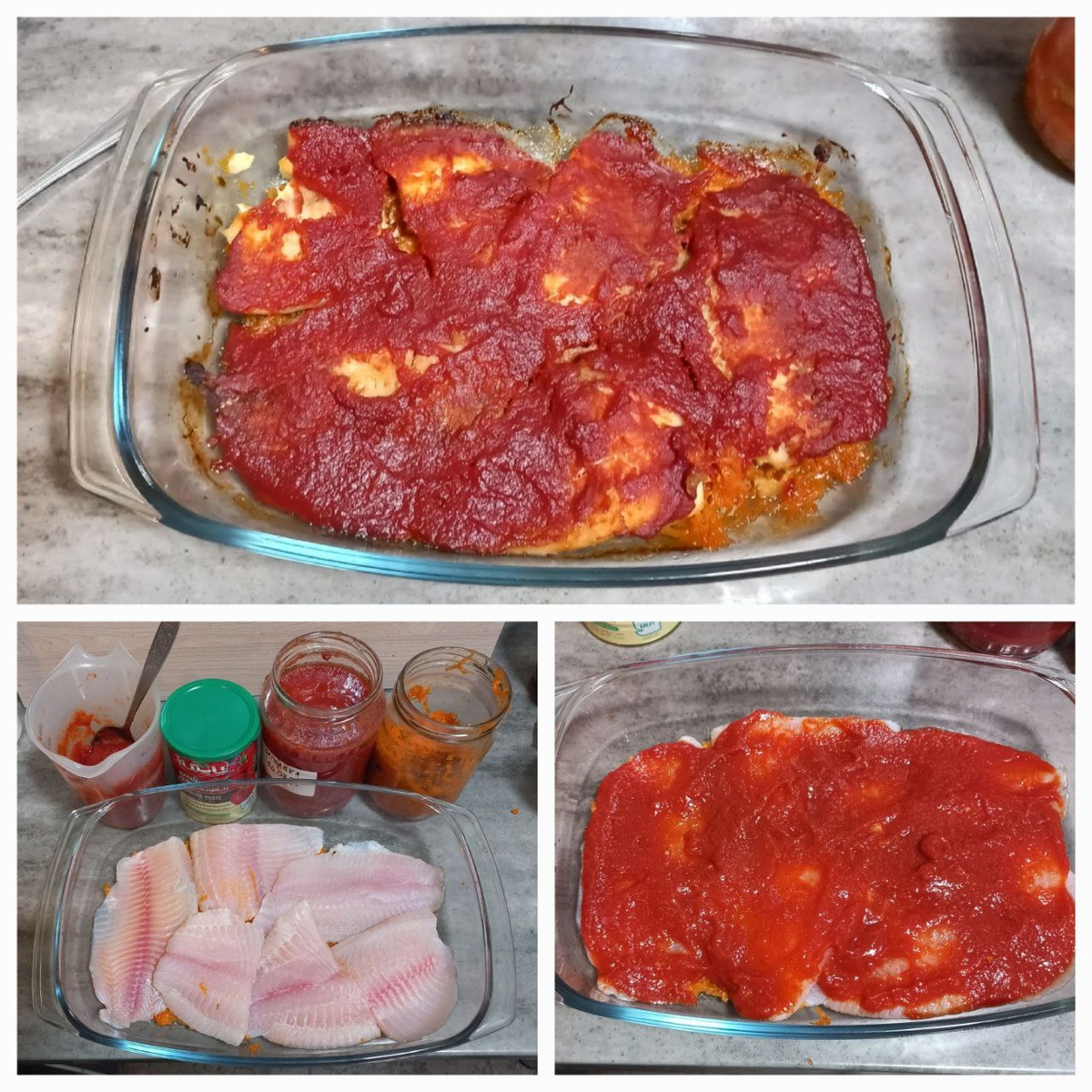 Томатный соус сделан из домашней томатной заправки (3 части) и иранской томатной пасты (2 части) + соль, сахар. Форму смазать растительным маслом, положить тонкий слой мелко натертой моркови, законсервированной по типу корейской, сверху рыбу крупными кусками. Полить соусом и поставить в духовку, нагретую до ~200°С. Запекать 30 мин. Готовую рыбу оставить в духовке для подсушивания, но не для высушивания😉. Есть в любом виде