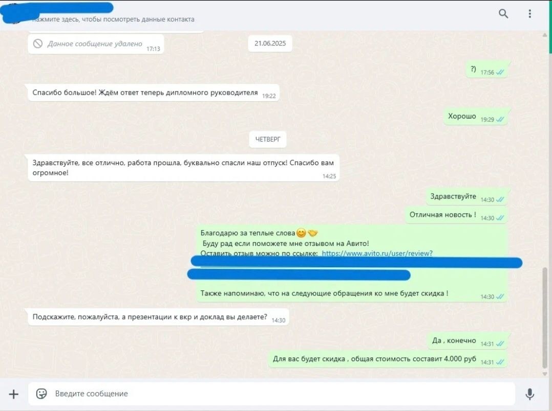 Быстро, профессионально, по разумным ценам. С заботой о вашем времени и уважением к вашим жизненным обстоятельствам. Спасибо за то, что доверяете мне свои проекты! Помимо дипломных работ, я работаю и с другими типами проектов: За бесплатной консультацией — сюда 👉НАПИСАТЬ МНЕ В ВК или написать в Telegram @volgapkinStud МОЙ КАНАЛ В TELEGRAM СООБЩЕСТВО В ВК ОТЗЫВЫ О МОЕЙ РАБОТЕ