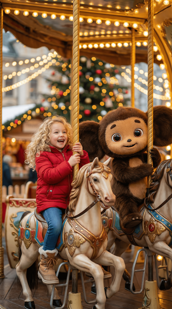 Как создать новогоднюю фотосессию с Чебурашкой на карусели через нейросеть в 2026 году