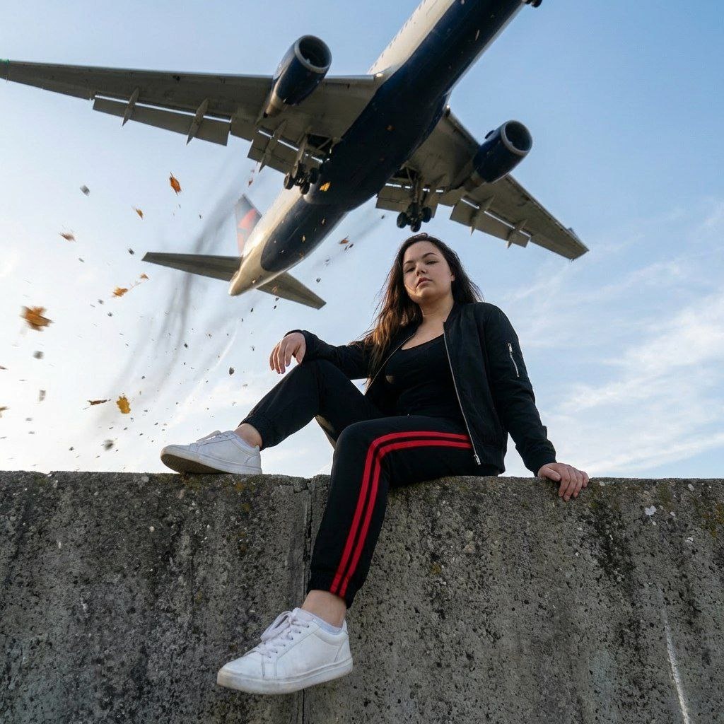 😀Выбираем "нейросети" 😀Нажимаем "Nano Banana" 😀Нажимаем "Nano Banana Pro" 😀Прикрепляем через скрепку свое фото и выбранный промпт 😀Наслаждаемся результатом🫶 Создай фото не меняя черты лица и цвет волос. Low‑angle cinematic photo: young woman seated on a concrete ledge, one knee bent, other leg hanging, wearing black zip‑up jacket over a black tank, black jogger pants with two bold red stripes down the side, white low‑top sneakers. Long dark hair blown dramatically by wind, loose strands framing neck and shoulders. Hands relaxed — одна опирается на колено, другая на кромку парапета. Над ней крупный пассажирский самолёт пролетает очень низко, создавая ветровую волну и тёмные следы в небе; в воздухе летят осенние листья и мелкая каменная фракция, немного motion blur на частицах и лёгкая пыльная дымка от ветра. Небо бледно‑голубое с тонкими перистыми облаками, драматичный свет — мягкий бок/контровый от солнца, подчёркивающий контуры фигуры и фактуры одежды. Стиль: photoreal, cinemat