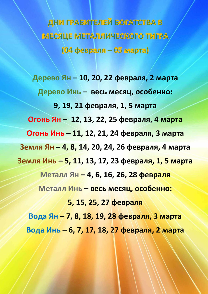 Дни Грабителей Богатства в месяце Металлического Тигра (04.02.2026 - 05.03.2026)