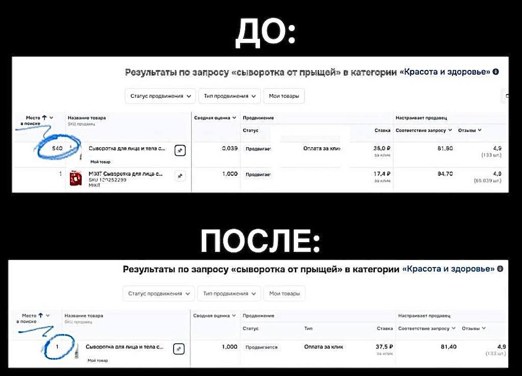 Было: по целевому запросу «сыворотка от прыщей» карточка товара находилась на 540 месте в поиске: ставка за клик — рабочая, но позиция низкая, трафик слабый, эффективность оставляла желать лучшего. Чтобы стать ТОП 1: при этом: - ставку за клик не повышали; - оставили ту же рекламную кампанию. Стало: позиция карточки выросла с 540 места до 1-го, без повышения ставки, сохраняя ДРР Отметим, карточка начала занимать более высокие позиции не за счёт увеличения бюджета, а потому что Ozon стал правильно понимать товар и показывать его нужной аудитории. Именно так SEO влияет на вашу рекламу. Как понять какие ключи прокачивать и как выходить в ТОП без увеличения ставки — мы подробно разбираем в практико-ориентированном курсе по SEO для Ozon, который уже открыт на платформе Миг Клик — https://mig-click.ru (ищите во вкладке "обучающие видео")