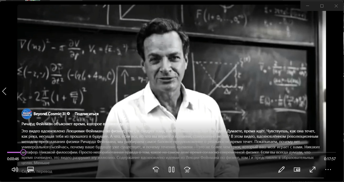 Инспирация видео в духе собраний сочинений Фейнмана, это семейный роман? Подросток, что ищет в космосе и квантовой механике примирения со своими инстинктами, или нынешний или бывший учитель, что теперь, кроме прочего, ведёт блог на Фейсбук. Столь стыдливый и праведный, что ни только не показывает обнажённое тело, но свои мысли обёртывает в тексты фейкового Фейнмана. И это в Нью Йорке.Видимо ещё и поэтому городе контрастов. Но тексты бывают не плохи для научно популярной литературы, для «научпопа». Не всякий из них, не весь из избранного, но иногда блещет умом, ни только стремлением противоречить себе противореча другим, бессознательно ли оно или нет. Почему же все таки, нет? Потому что Фейнман известен, а автор нет? Да и вообще фейк, это в тренде? Может быть. Тем не менее, скажем, персонажи диалогов Галилея, хоть и вымышленные и никогда не существовавшие, как и фейковый Фейнман, но никому не известны, как прообраз последнего. То есть, всякий раз персонажи лишённые прообраза, и разве что, в авторе, в Галилее. Скорее годиться "Автор и герой", чем глубокий фейк ИИ и оператор запроса. И да, конечно, большая часть видео материала создана ИИ, и, видимо, по запросу. То есть, автор оператор может быть честен, и в этом, по крайней мере перед собой. Он не выдаёт текст ИИ за вой текст, но только пишет дисклеймеры. Можно, конечно, предположить, что озвучка видео, это озвучивание текстов автора, коль скоро, одно из видео на канале вообще не было озвучено. Но тогда, и его, и зрителя ждёт одна и та трудность, что большей частью артикуляция губ и мимика лица не будет совпадать с речью, с озвучиванием. Так что, хотя и теперь видимо можно найти расхождения, но скорее всего, большая часть видео, это целиком продукт ИИ. И да, автор все же, создал название канала, что содержит маленький, но подвох: I это не 1, но именно I.