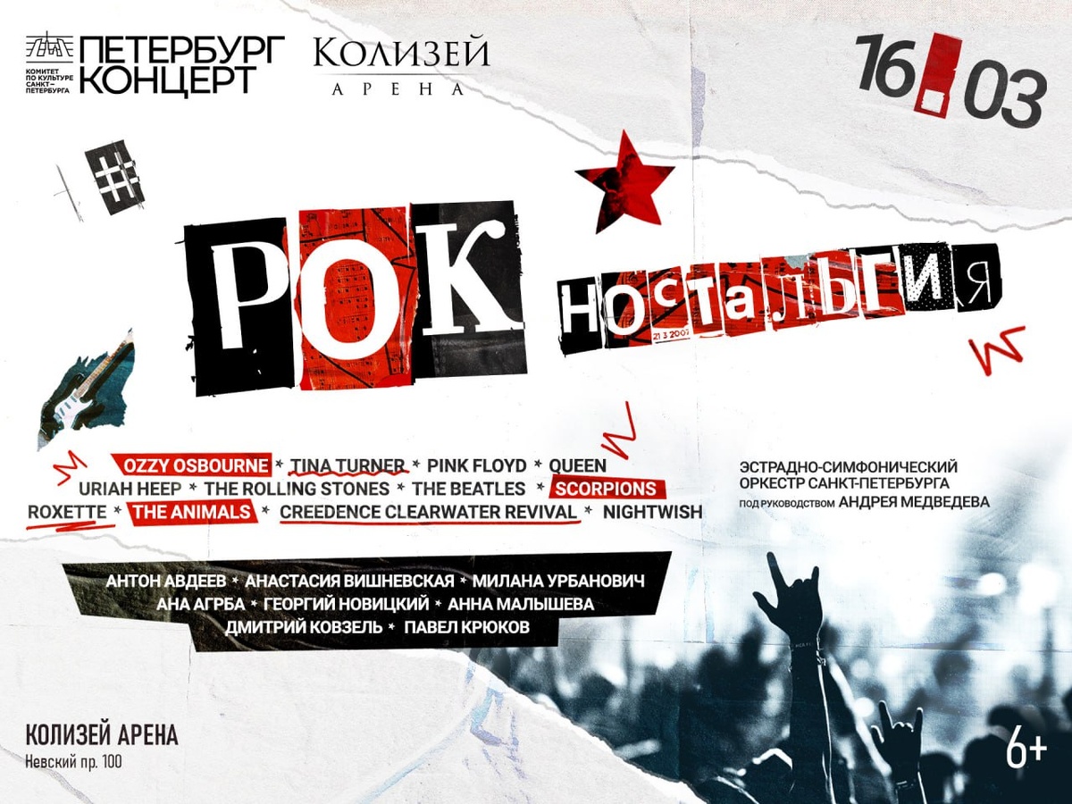 эксклюзивное музыкальное путешествие — в концертном зале «Колизей Арена» состоится концерт «Рок-ностальгия». Публику ждет встреча с культовыми произведениями, которые когда-то подарили им рок-музыканты. В программу вошли симфонические интерпретации песен всемирно известных исполнителей: The Beatles, Queen, Creedence Clearwater Revival, The Animals, Uriah Heep, Scorpions, Roxette, The Rolling Stones, Nightwish и не только! В грандиозном концерте примут участие звезды петербургской эстрады: Антон Авдеев, Анастасия Вишневская, Георгий Новицкий, Ана Агрба, Павел Крюков, Милана Урбанович, Дмитрий Ковзель и Анна Малышева. Не упустите шанс пережить незабываемые музыкальные моменты и окунуться в мир рок‑классики в новом звучании! 🎫 Билеты: 16.03 19:00 «Рок-ностальгия»
