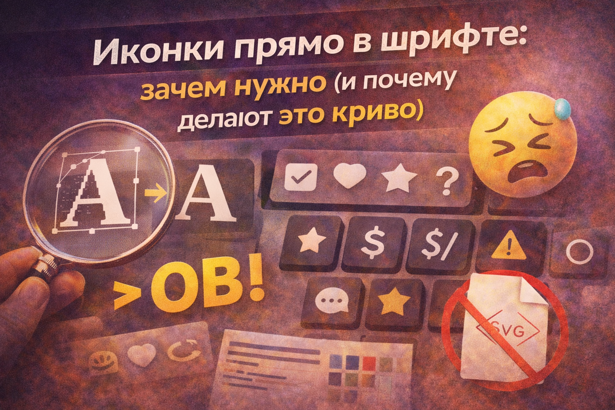 Есть один приём, который выглядит как магия, когда ты видишь его впервые: ты печатаешь текст — и вдруг вместо букв появляются иконки. Не вставкой, не картинкой, не SVG. Просто… символы внутри шрифта. И да, это реально удобно. Но ровно до того момента, пока ты не начинаешь использовать это «как попало». Тогда магия быстро превращается в боль: иконки исчезают, ломаются, не читаются, а разработка тебя тихо ненавидит. Давай по-человечески разберёмся, что это такое и когда оно действительно помогает. По сути это обычный шрифт, только в нём, кроме букв и цифр, есть ещё иконки и маленькие иллюстрации. Иногда это прям отдельный «икон-шрифт», где все глифы — иконки.
