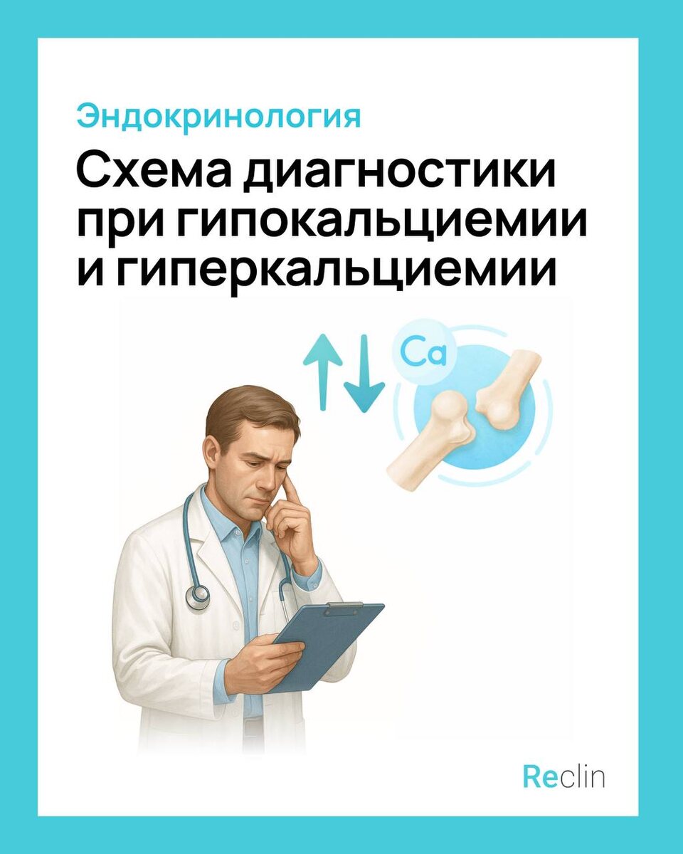 🧪 Какой показатель кальция действительно информативен? И о чём говорят отклонения от референсов? Разбираем всё по шагам в новом гайде: ✅таблицы с лабораторной диагностикой (+формула расчёта скорректированного кальция) ✅алгоритмы действий для уточнения диагноза ✅синдромы гипо- и гиперкальциемии: клиника, причины, классификация ✅нормокальциемические варианты патологий 🔎 Подробнее о диагностике и лечении самых частых причин нарушений кальциевого обмена — в наших кратких клинических рекомендациях: https://clck.ru/3RaFpk и https://clck.ru/3RaFpE 🎤 Reclin в MAX