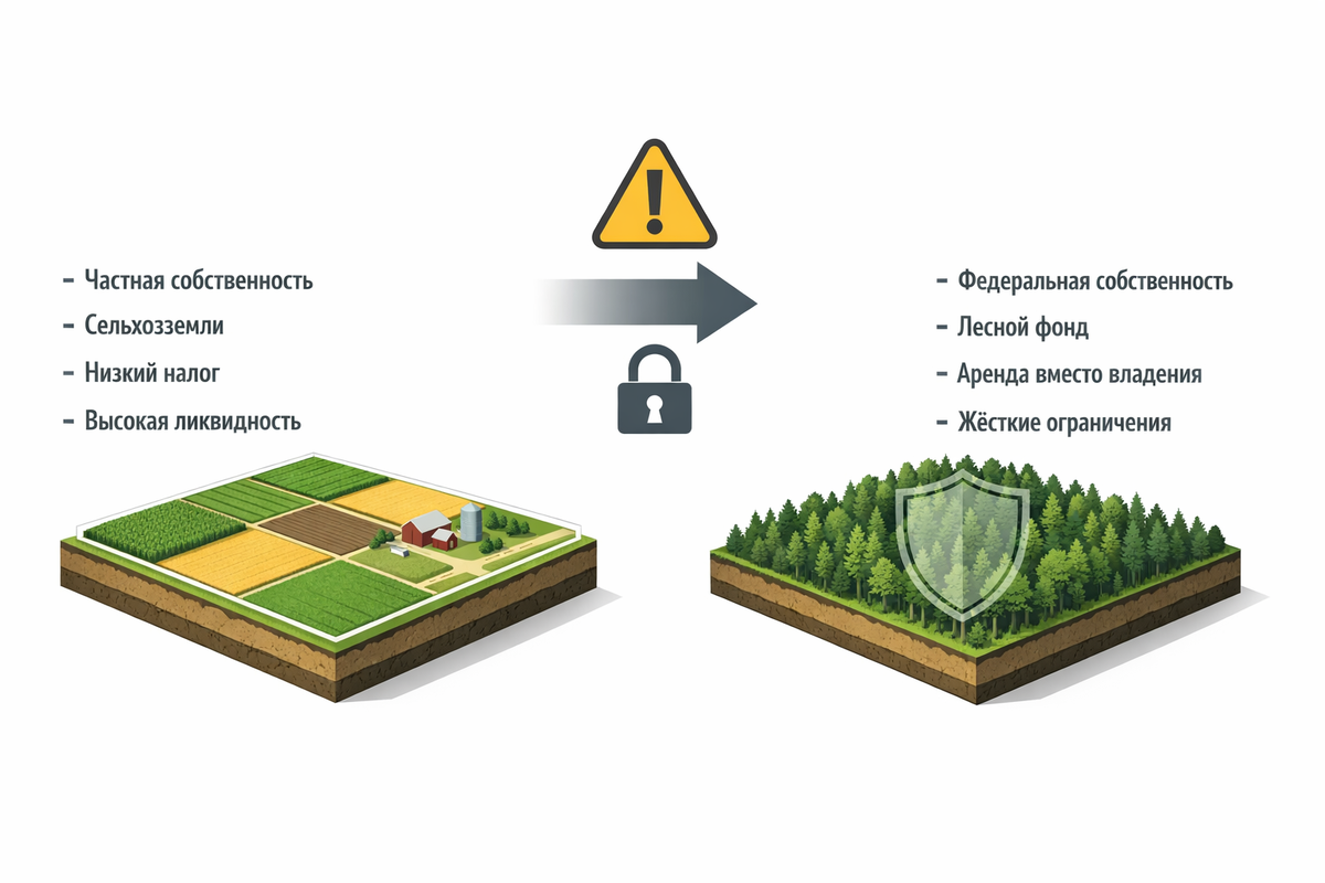 Инвесторы, купившие сельхозземли в расчёте на перепродажу или сдачу в аренду, допускают критическую ошибку при переводе в лесной фонд — стоимость и ликвидность актива падают.