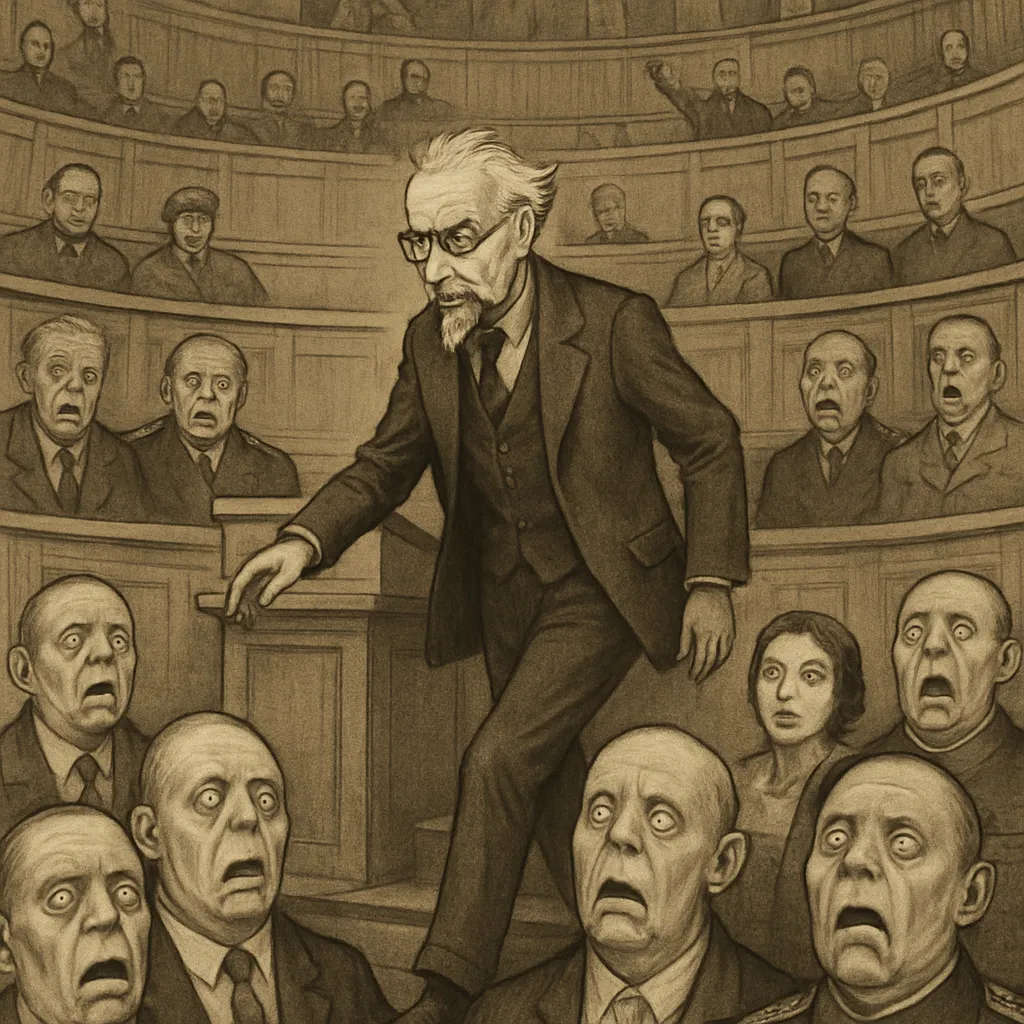 Профессор вгляделся в лица сидевших на первом ряду. Их глаза словно остекленели: бессмысленный взгляд, направленный в одну точку. Из уголка застывшего в улыбке рта председателя сбегала тоненькой струйкой слюна.
