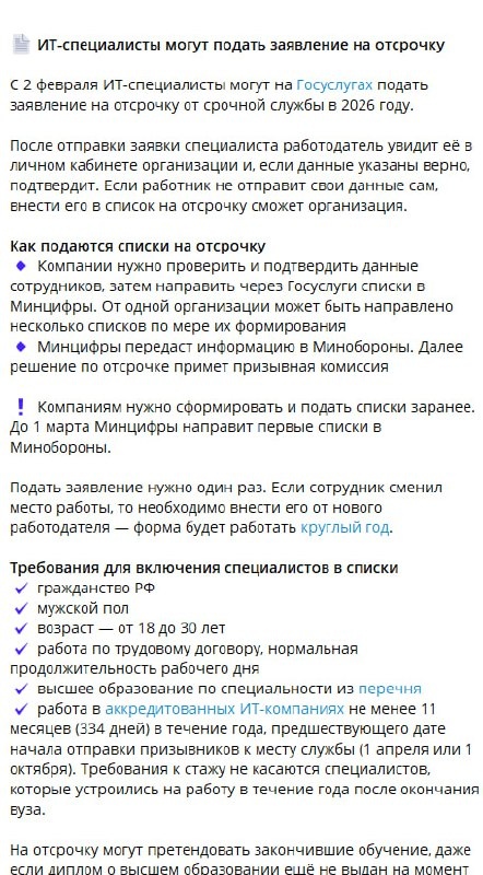 Если вы подлежите призыву, но работаете в ИТ, то бегите подавайте заявление на отсрочку. См. на картинке. И теребите, как теребите писю, работодателя, чтобы отправил. Ибо если работодатель не отправил - значит не подано! Русский ИТ бизнес