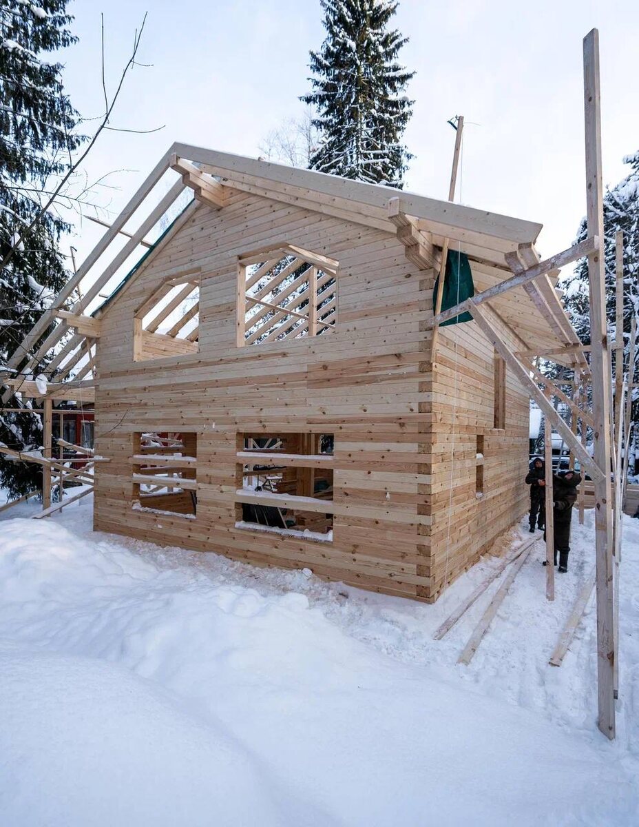 Это уже второй двухэтажный дом на этом участке. Первый — по проекту «Аврора» — мы возвели пять лет назад, а теперь строим дом для родителей наших заказчиков.