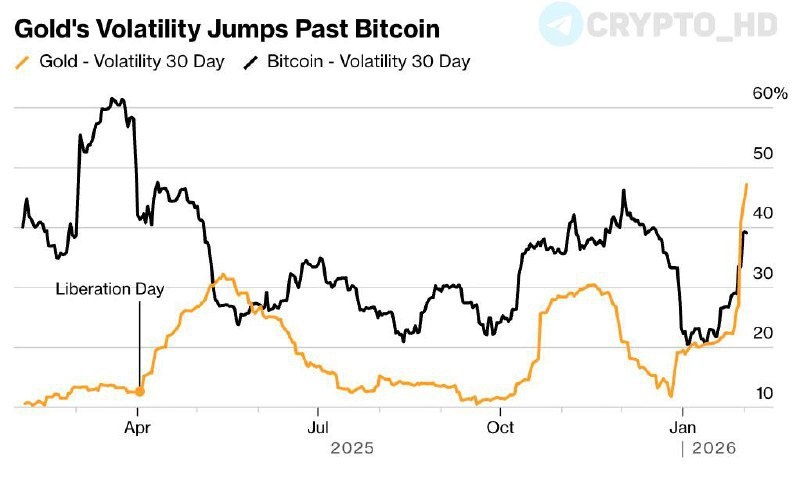 30-дневная волатильность Золота превысила 44% – максимум с кризиса 2008 года (у BTC = 39%). «Защитный актив» качает сильнее крипты. Золото обвалилось на 10% за день (с $5600 до $4400) – самое резкое снижение за 10+ лет. Биткоин тоже обвалился (-40% от пика), но Золото выглядит непредсказуемее. Crypto Headlines