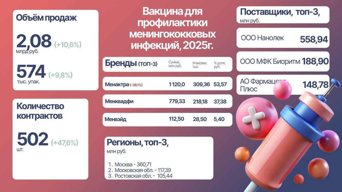 Рынок демонстрирует умеренный рост в деньгах и объёмах, но при этом перестройку внутри брендов. 🔹 Объём продаж в деньгах 2,08 млрд руб. (+10,6%) 🔹 Продажи в упаковках 574 тыс. (+9,8%) 🔹 Количество контрактов 502 (+47,6%) ➡️ Существенный рост числа контрактов при умеренном росте выручки говорит о дроблении закупок. 1. Менактра (Санофи) • Объём продаж: 1,12 млрд руб. • Доля рынка: 53,6% • Динамика: –38,1% Несмотря на лидерство, бренд демонстрирует падение, что указывает на перераспределение спроса в пользу альтернатив. 2. Менквадфи (Санофи) • Объём продаж: 779,3 млн руб. • Доля рынка: 37,4% • Упаковки: 218 тыс. Менквадфи главный бенефициар перераспределения рынка, ключевая альтернатива Менактре. 3. Менвэйд (Индия) • Объём продаж: 112,5 млн руб. • Доля рынка: 5,4% • Упаковки: 28,50 тыс. 1️⃣ ООО Нанолек — 558,9 млн руб. 2️⃣ ООО МФК Биоритм — 188,9 млн руб. 3️⃣ АО Фармацевт Плюс — 148,8 млн руб. ➡️ Рынок остаётся высоко концентрированным по дистрибуции. Эпидемиологический конте