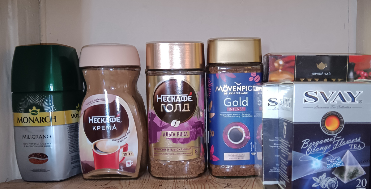 Здравствуйте, мои дорогие! У меня сегодня небольшой шок-контент, покажу какие мы на самом деле хомяки)). Наводила вчера порядок в шкафчике, где чай-кофе-какао храним, сама удивилась нашим запасам, решила и вам показать)). Или у всех так, у нас мало ещё? Что-то сами в запас покупали, что-то купили в подарок, но так вышло, что не подарили, а что-то мы в подарок получили. Теперь на год хватит, не меньше (с учетом того, что мы ещё и молотый кофе пьем, по утрам). Шкафчик, на самом деле, маленький, но банки все равно большие, двойные. "Нескафе крема", наверное, самый приличный из самых недорогих. С синей этикеткой давно уже стоит у нас, так и не пробовали пока, что это за кофе. Чай в сине-серых упаковках, SVAY, очень мне нравится, но скажу, что заказывала по каким-то очень большим скидкам, за полную цену не покупаю, её кто во что горазд ставит, дорого. Второй ряд - "Карт нуар" наш самый любимый уже долгое время, такой вот, в черных банках и в темно-фиолетовых еще, тот "молотый в растворимом