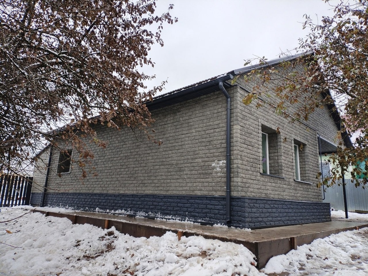 Дом на фото обшит фасадными панелями «Фагот» цвета «Раменский». Эти панели очень популярны из-за их двойственной фактуры: ровной кирпичной кладки и ломаного камня. «Фагот» придает зданию уверенный вид и защищает стены от ультрафиолета, ветров, перепадов температур, механических повреждений. Под панелями стены можно утеплить и дополнительно изолировать от влаги. Тогда в доме будет комфортнее, и счета за отопление снизятся.