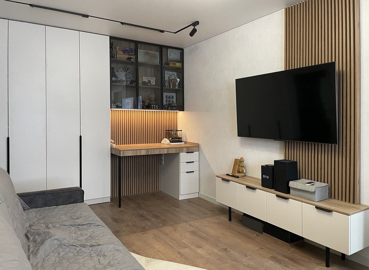 Гостиная с рабочей зоной и стеллажами для хранения. Гостиная тут выполняет роль и мини кабинета (рабочая зона), и мягкая зона с тв, и обеденная-столовая. Плюс стеллажи с довольно большим объемом для хранения разного-всякого, помимо гардеробной. При планировке определились с оптимальными размерами и расстояниями, чтобы максимум полезного пространства, но ничего не мешало друг другу и не выглядело слишком громоздко, не «по росту» для этой комнаты) Однотонный декор максимально нейтральный, под дерево – максимально в тон с полом. Акценты на черной фурнитуре, тонированном стекле и теплой подсветке. В остальном мебель максимально влита в интерьер, часть этого пространства. Для комфорта на мебель перенесли несколько блоков розеток, там же разместили и выключатель подсветки (невидимый сенсорный) Рейки все еще продолжают оставаться актуальными) Скоро станут классикой. Главное – помнить об их разумном дозированном применении в интерьере. #тЫквинЛес #гостиная #рабочаязона #мебель