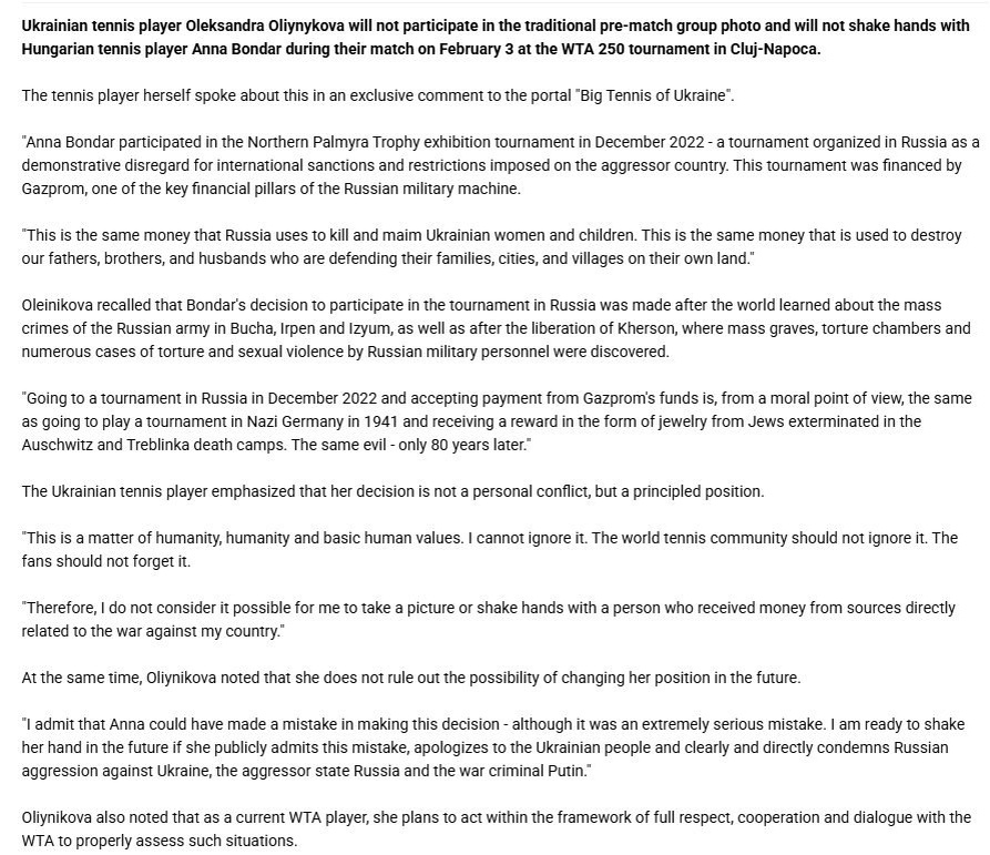 ⚡ 🎾 Украинская теннисистка Олександра Олийникова отказалась от предматчевого фото и рукопожатия с венгеркой Анной Бондарь на турнире WTA