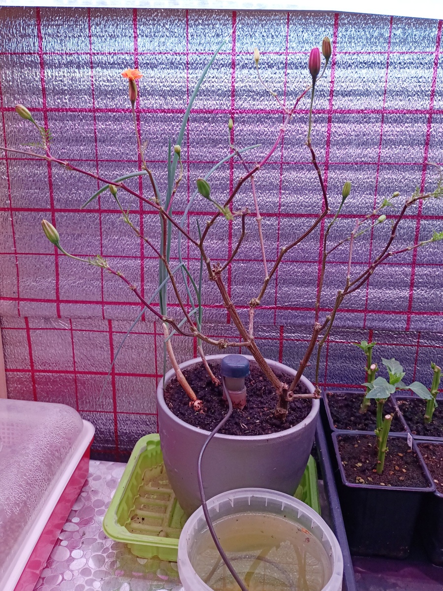 Установил автополив, чтоб на 2-3 недели хватило. При листве такой объём воды выпивает куст за пару дней. Вернусь с Ташкента и погляжу что с ним, кустом, делать. Если с нижних пазухов пойдут новые листья, то верха обрежу и буду держать так до тёплой весны. После в грунт. Если же новые листья идут лишь с кончиков стволов — будем прощаться с этим кустом.