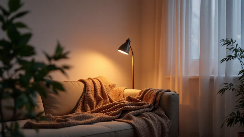 Начните с малого: уберите верхний свет, поставьте торшер, добавьте плед, зажгите свечу с тёплым ароматом.