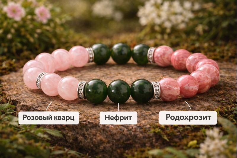 Я предложил Анне браслет «Любовь к себе и уверенность». Он состоит из трех камней: розовый кварц, нефрит, родохрозит. Все натуральные, подобраны специально для Тельца.