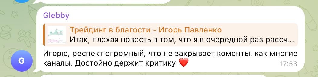 Я, как и все то боюсь, то жадничаю, такой же живой человек как и все А крипта, это, кажется, единственная сфера, где опыт играет скорее против тебя, чем за Зайдите на любой канал, сопоставимый по аудитории, там либо нельзя писать, либо тишина То есть всем пофиг, читают левой коленкой Нет ничего хуже безразличия И посмотрите какой актив у нас под каждым постом, десятки комментариев, сотни огоньков И когда вы так поддерживаете и не важно в плюс или минус, у меня нет шансов сдаться, забить на канал, или просто рисовать в 2 стороны, переобуваясь при каждом шорохе потому что времена меняются, а человеческие отношения остаются спасибо вам за вас!❤️