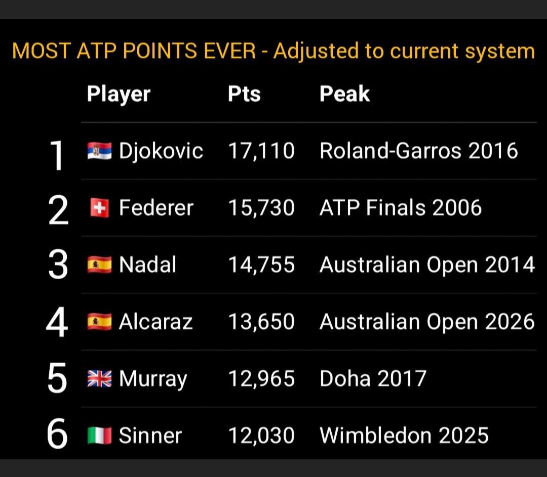 🎾 1. Новак Джокович – 17 110 2. Роджер Федерер – 15 730 3. Рафаэль Надаль – 14 755 4. Карлос Алькарас – 13 650 5. Энди Маррей – 12 965 6. Янник Синнер – 12 030 Подпишись на Эйс и точка