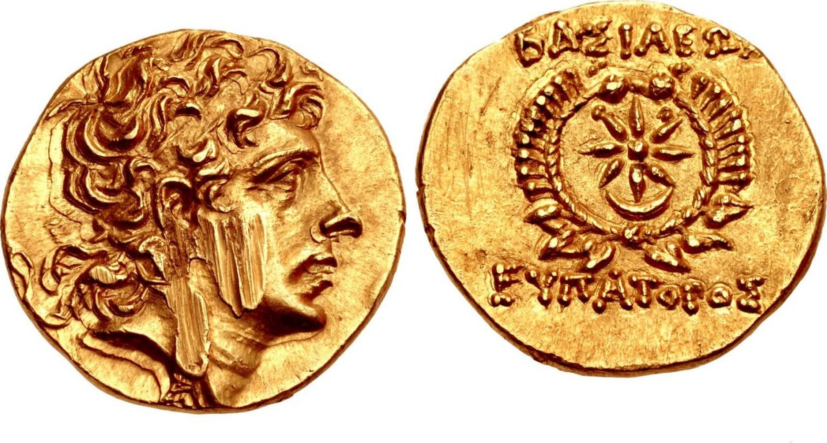 Данный статер из бывшей коллекции Г. фон Аулока был выставлен в 2015 году на аукционе CNG (Classical Numismatic Group, Inc. Auction 100 - Part 1 7 October 2015, Lot 64). При стартовой цене в 10 000 USD монета была продана за 19 000. Аукционисты, в описании, привязали выпуск монеты к Амисскому или Синопскому монетный двор. Отчеканен около 93/2 г. д.н.э. Вес 8,46 г, диаметр 20 мм Анохин считает, что, возможно, данная монета выпущена на Боспоре в 65-63 гг. д.н.э., при подготовке Митридатом новой войны с Римом. Соответственно, если организаторы аукциона пишут, что это "Уникальная и первая золотая монета времён правления Митридата", то, по мнению Анохина - это последний золотой выпуск царя. Л.С.: Голова Митридата в диадеме вправо О.С.: ΒΑΣΙΛΕΩΣ ΕΥΠΑΤΟΡΟΣ. Звезда и полумесяц в венке. #нумизматика #Боспор #история #Митридат #Пантикапей