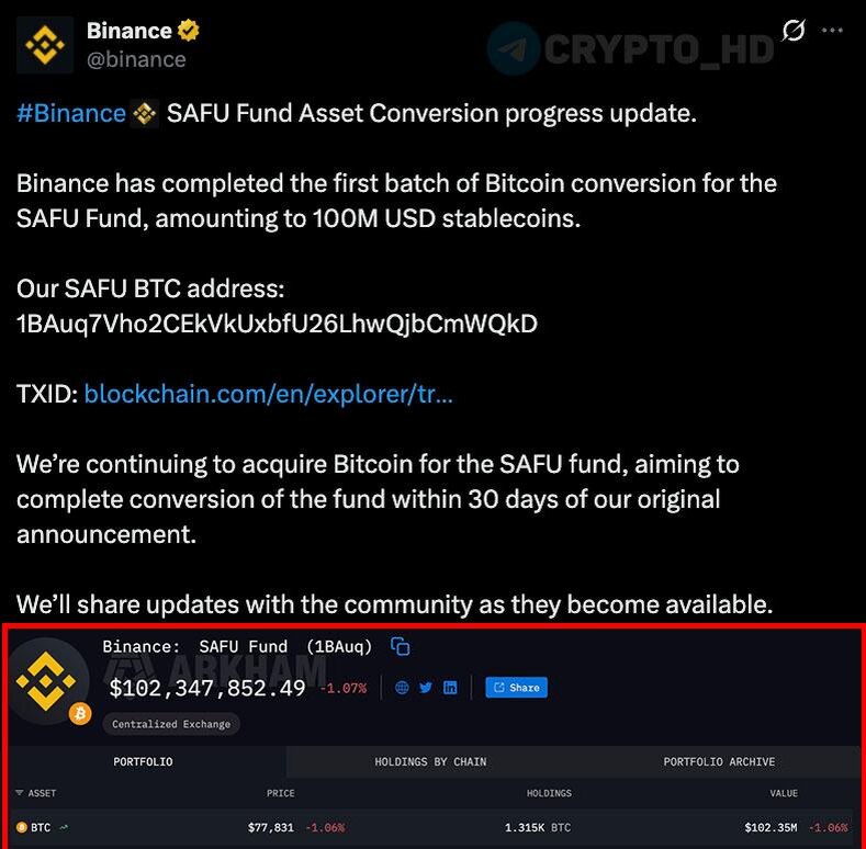 Π Binance ΠΌΠ΅Π½ΡΡΡ ΡΡΡΡΠΊΡΡΡΡ ΡΠΎΠ½Π΄Π° Π·Π°ΡΠΈΡΡ Π°ΠΊΡΠΈΠ²ΠΎΠ² ΠΏΠΎΠ»ΡΠ·ΠΎΠ²Π°ΡΠ΅Π»Π΅ΠΉ (SAFU) β Π² ΡΠ΅ΡΠ΅Π½ΠΈΠ΅ 30 Π΄Π½Π΅ΠΉ $1,000,000,000 ΠΊΠΎΠ½Π²Π΅ΡΡΠΈΡΡΡΡ ΠΈΠ· ΡΡΠ΅ΠΉΠ±Π»ΠΊΠΎΠΈΠ½ΠΎΠ² Π² ΠΠΈΡΠΊΠΎΠΈΠ½. Π‘Π΅Π³ΠΎΠ΄Π½Ρ ΡΠΎΠ½Π΄ ΠΊΡΠΏΠΈΠ» 1315 BTC ($100m). Crypto Headlines