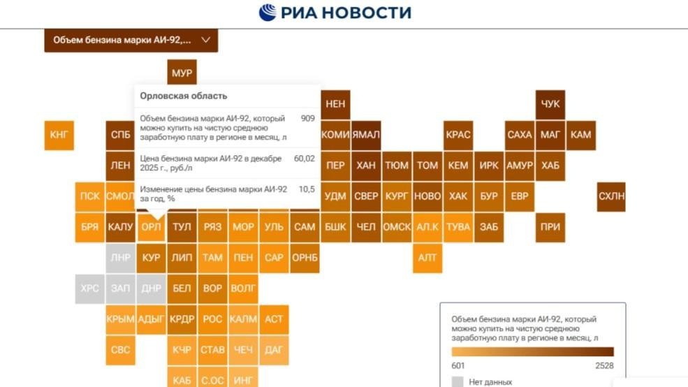 Регион занял 70-ю позицию в общероссийском рейтинге доступности бензина, составленном РИА Новости. https://orlvestnik.ru/news/na-srednyuyu-zarplatu-v-orlovskoj-oblasti-mozhno-kupit-909-litrov-benzina-ai-92 ✅ Подпишись на канал 📩 Прислать новость 👉 Мы в MAX #Орловский_вестник #Орловская_область