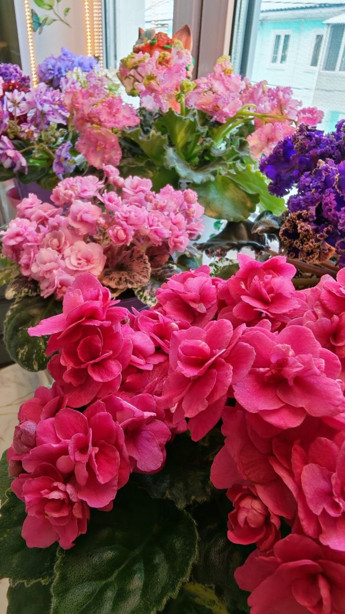 ! Сегодня у нас позируют: 1. На переднем плане волшебный НК-Клубничный Капкейк с красивой розеткой полу-мини с нежной кроновой пестролистностью и удивительными "клубничными" цветочками-розочками. 2. Один из наших любимых сортов: Rose Bouquet с шикарной некрупной розеткой с мозаичной розовой пестролистностью и нежно-розовыми цветами-розочками с более насыщенной и яркой серединкой. 3. Красивая фэнтезийная фиалка-химера МК-Ветер Перемен с махровыми цветочками с чёткой белой полосой по середине лепестка и фэнтезийным розово-фиолетовым окрасом по краям. Стоит отметить и весьма некрупную розеточку этой прекрасной шапочной дамы! 4. Яркая бордово-красная фиалочка Christmas Dress с махровыми цветочками среднего размера и тоже некрупной красивой темнолистной розеточкой. Стоит отметить, что эту красавицу подарила нам с мамой наша подруга Олечка с канала на Дзен "Дачная Мозаика" 🙏