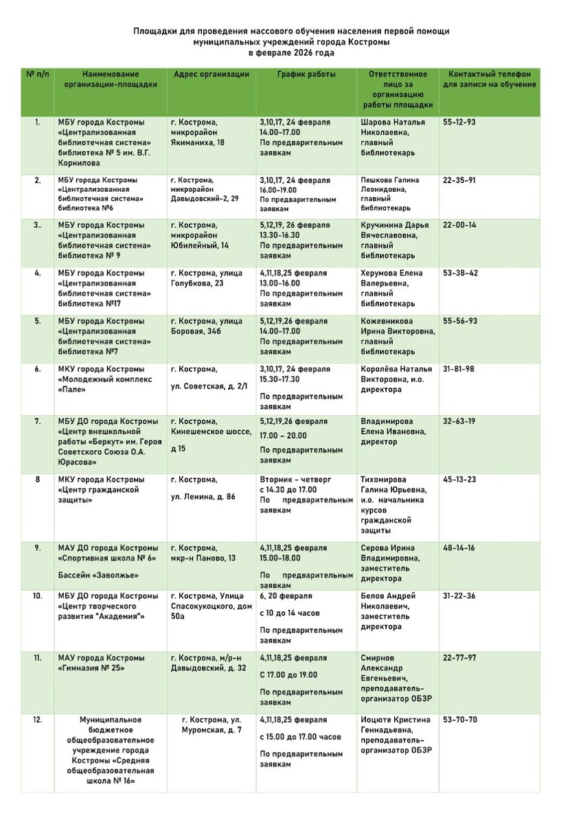 В Костроме в феврале работают сразу несколько площадок, где горожан бесплатно обучают навыкам первой помощи. Не для галочки и не «по инструкции», а с разбором реальных ситуаций — от внезапного обморока до сердечного приступа или травмы на улице. Первая помощь — это не про медицину в чистом виде и не про «надо быть врачом». Это про базовые действия, которые может и должен знать обычный человек: как вызвать скорую, что делать до ее приезда, как не навредить и как не растеряться в критический момент. Часто именно первые минуты решают все. Такие занятия особенно полезны родителям, пожилым людям, тем, кто работает с детьми, занимается спортом или просто много времени проводит вне дома. Да и в обычной жизни ситуации случаются самые разные — в транспорте, во дворе, в магазине или на работе. Обучение проходит на базе муниципальных учреждений: библиотек, молодежных центров, школ, спортивных объектов и центров гражданской защиты. Формат — очный, в небольших группах, по предварительной записи. Эт