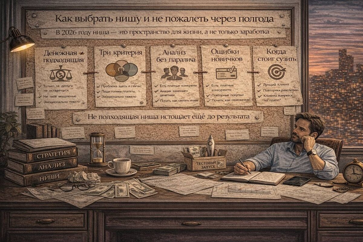 Выбор ниши — один из самых переоценённых и одновременно недооценённых этапов старта. Переоценённых — потому что его пытаются «вычислить идеально». Недооценённых — потому что именно здесь закладывается будущая усталость, выгорание или устойчивый рост. В 2026 году ниша — это уже не просто «где есть деньги». Это пространство, в котором ты сможешь жить и думать месяцами, а не выгореть за полгода. 🧠 Почему «денежная ниша» ≠ подходящая ниша Одна из самых частых ловушек — выбирать нишу только по критерию доходности. На практике «денежные ниши» часто оказываются: эмоционально тяжёлыми; перегретыми; требующими постоянной борьбы за внимание; не совпадающими с твоим типом мышления. Деньги в нише есть почти всегда. Вопрос не в этом. Вопрос — хватит ли у тебя ресурса оставаться в ней долго. ⚖️ Три критерия здоровой ниши У устойчивой ниши почти всегда сходятся три вещи: 1️⃣ Спрос Проблема существует здесь и сейчас, а не «может появиться в будущем». 2️⃣ Платёжеспособность Люди не просто жалу