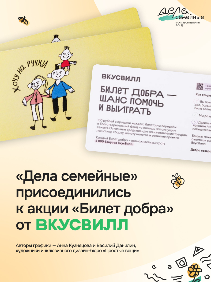 Друзья, отличные новости! Теперь поддержать наши подопечные семьи можно в любимом супермаркете — и выиграть бонус от ВкусВилл. Фонд «Дела семейные» стал партнером ежемесячной акции «Билет добра» от сети супермаркетов ВкусВилл и инклюзивного проекта «Простые вещи». Как это работает?