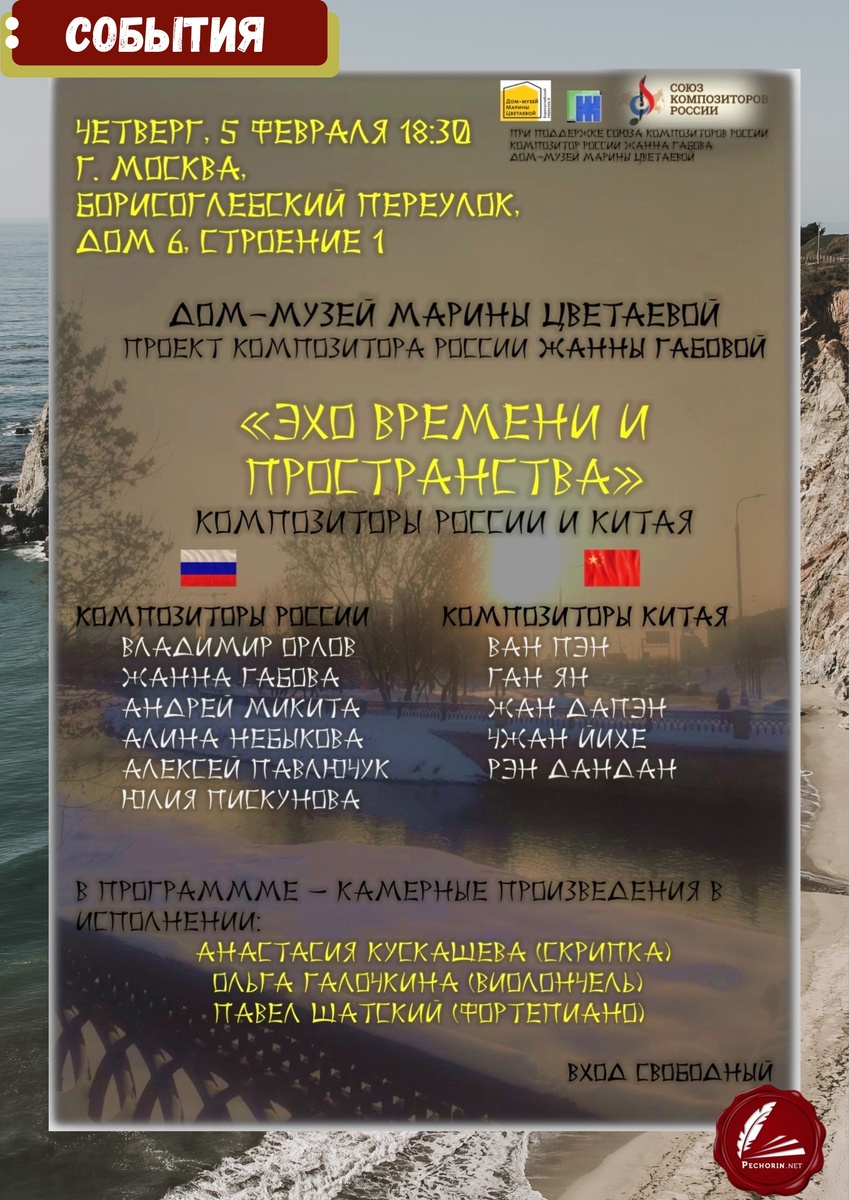 🎻Сочинение «Маяки» Алины Небыковой для скрипки, виолончели и фортепиано, созданное по прочтении одноименного сборника рассказов серии «Время прозы», прозвучит 05 февраля на уникальном концерте в рамках международного проекта «Эхо времени и пространства», где будут представлены произведения современных композиторов России и Китая. 📍Ждем вас в 18:30 в Концертном зале Дома-Музея Марины Цветаевой (Борисоглебский переулок д.6,с.1). В программе камерные произведения следующих композиторов: Владимир Орлов Жанна Габова Андрей Микита Алина Небыкова Алексей Павлючук Юлия Пискунова Ван Пэн Ган Ян Чжан ДаПэн Рэн ДанДан Чжан Йихе Сочинения исполнят: Анастасия Кускашёва (скрипка) Ольга Галочкина (виолончель) Павел Шатский (фортепиано) Вход свободный. Количество мест ограничено.