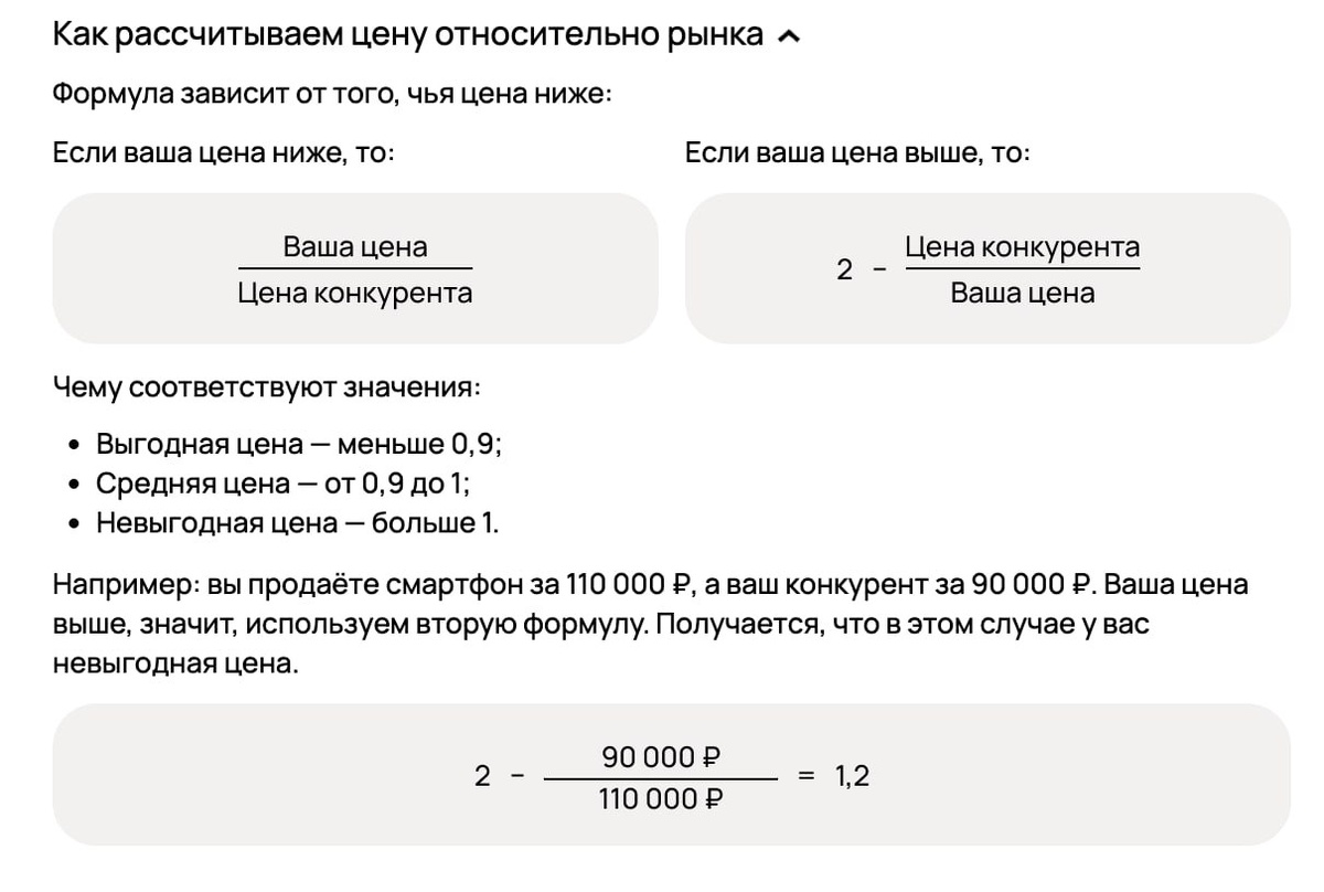 Пример: Вы выставили смартфон за 110 000 ₽, а конкурент — за 90 000 ₽. Ваш коэффициент = 110 / 90 ≈ 1,22 → «невыгодная цена».