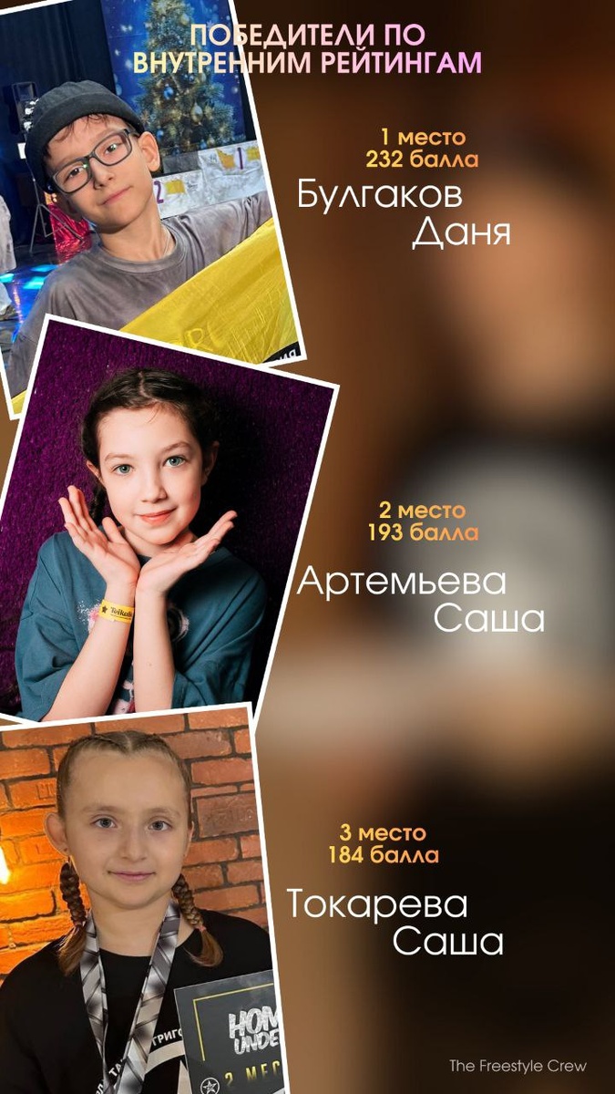 : 1. Булгаков Даниил - 232 2. Артемьева Александра - 193 3. Токарева Александра - 185 ТОП 10: 1. Булгаков Даниил - 232 2. Артемьева Александра - 193 3. Токарева Александра - 185 4. Ягодкина Яна - 184 5. Новикова Мария - 180 6. Антонова Соня - 178 6. Данилова Елизавета - 178 7. Тарабрина Ксения - 158 8. Тужилкин Дмитрий - 155 9. Биляр Диана - 149 10. Идрисова Маргарита - 143 Победители уже обрели свои награды: 1 место - 3 месяца бесплатных занятий 2 место - 3 месяца занятий со скидкой 50% 3 место - 3 месяца занятий со скидкой 25%