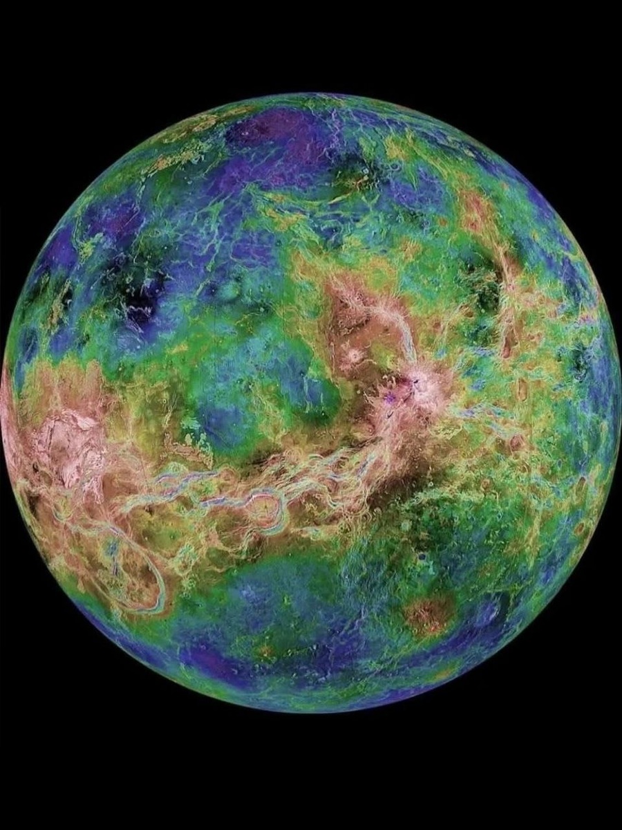 ☠🔥 Перед вами Венера такой, какой её увидел зонд «Магеллан». Аппарат не фотографировал поверхность в привычном смысле — плотная атмосфера планеты непрозрачна для света. Вместо этого использовалась радиолокационная съёмка, позволяющая «заглянуть» сквозь облака серной кислоты. Цвета на изображении условные: это композит из множества данных, где оттенки подчёркивают перепады высот — равнины, горные массивы и гигантские вулканические структуры. За этой завораживающей картиной скрывается смертельная реальность: 🌡 температура около 460 °C ☁ давление — как на глубине километра под водой 🧪 атмосфера, насыщенная ядовитыми газами Самая красивая ловушка Солнечной системы — планета, которая выглядит как рай, но убивает за минуты. Magic Universe 🌌