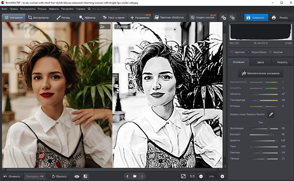 ФотоМАСТЕР — софт с большим количеством инструментов, автофункций, фильтров и интуитивно-понятным интерфейсом. Для редактирования изображений предусмотрены следующие инструменты: кривые, HSL, баланс белого, настройка экспозиции, исправление геометрических искажений, пресеты для бьютификации и кадрирования в соответствии с популярными пропорциями. Перевод фотографии в рисунок возможен в стиле карандашного наброска в ч/б или цвете.