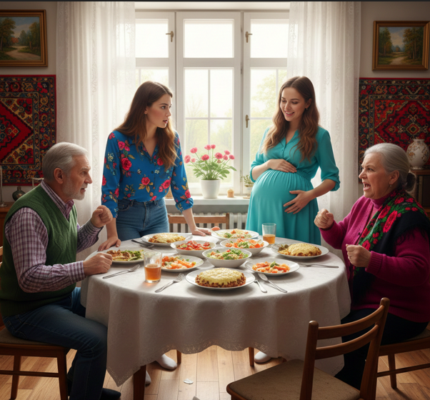 Напротив, сияя как начищенный чайник, сидела моя сестра Зоя. Она была на седьмом месяце и, казалось, специально выставляла живот так, чтобы он задевал край стола. Её муж, тихий и исполнительный, подкладывал ей лучшие куски.