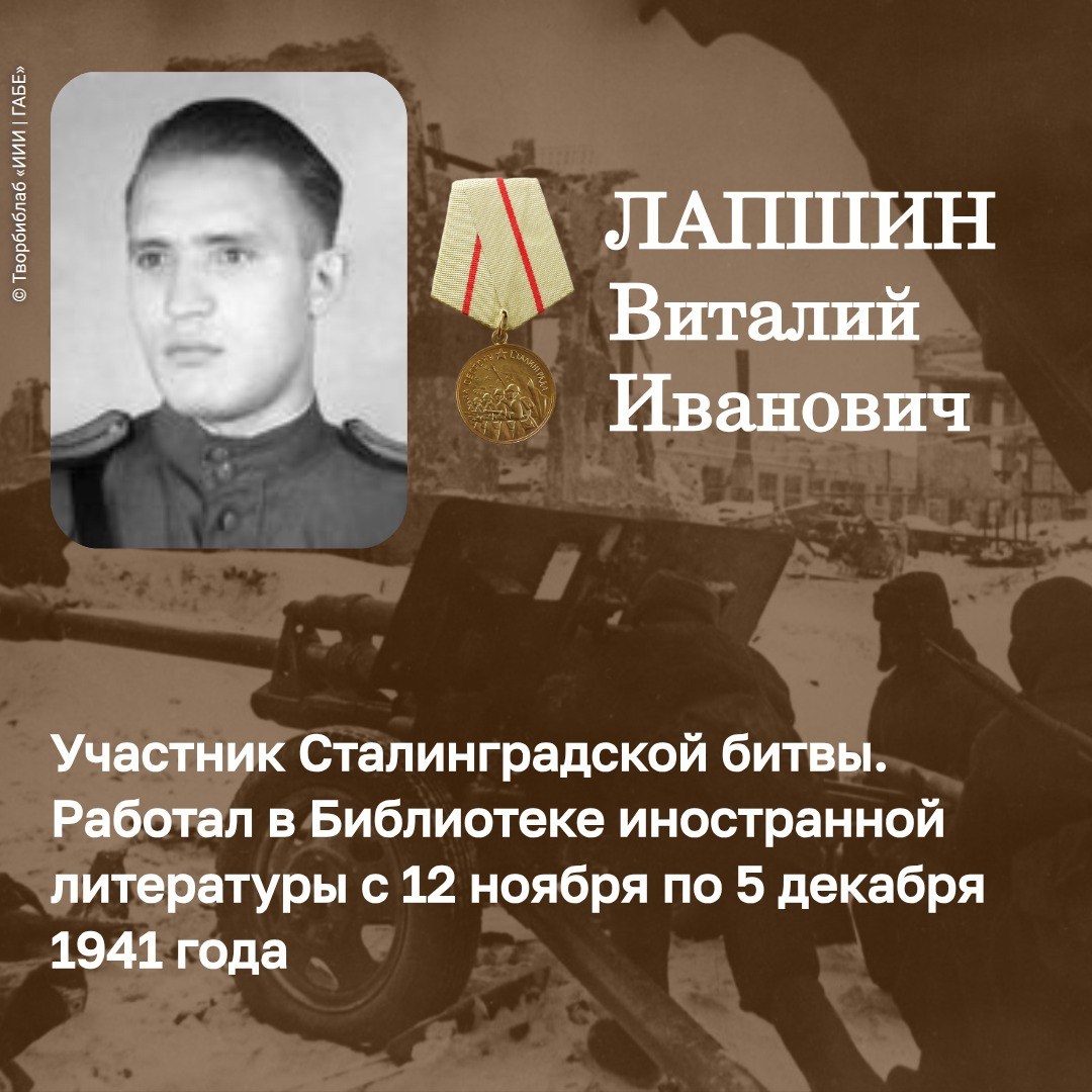 , которые давно ушли, но оставили яркий след в истории. Их имена и судьбы становятся частью твоей собственной профессиональной жизни, наполняя сердце чувством глубокой признательности и ответственности перед памятью. ❤️🔥 Сегодня, отмечая победу в Сталинградской битве, хочется вспомнить сотрудников Библиотеки иностранной литературы, которые сражались на фронтах Великой Отечественной войны. Многие из них получили медаль «За оборону Сталинграда», рискуя жизнью, защищая город и страну. Читая строки Василия Лебедева-Кумача, напечатанные в «Комсомольской правде» в день победы под Сталинградом, 2 февраля 1943 года, вновь осознаёшь величие подвига наших предков: Вся Родина взволнована и рада, — В Москве, на фронте, в селах и в цехах. Победа под стенами Сталинграда У каждого сегодня на устах. И от Кавказа и до Владивостока, От Балтики до северных морей Народ исполнен гордостью высокой За доблестных своих богатырей. Он славит полководцев и героев, Спешит достойным почести воздать И повтор