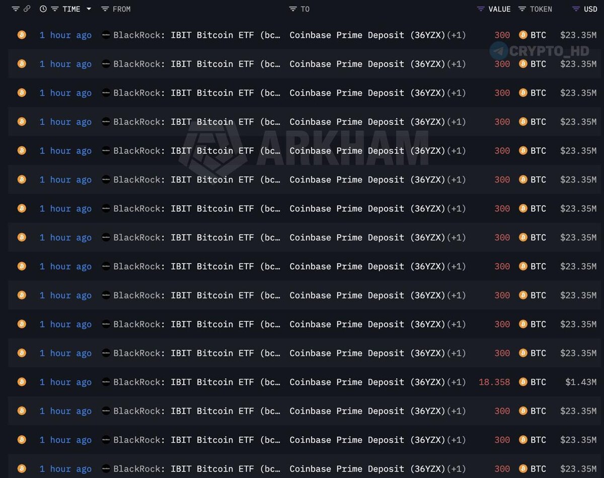 Компания BlackRock перевела 6918 BTC ($538m) и 58,327 ETH ($133m) на биржу Coinbase Prime – кошелек