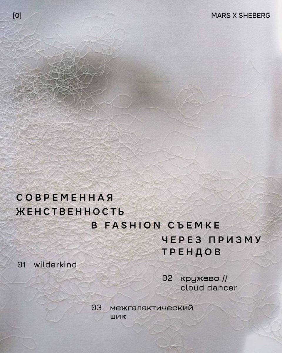 Совместное исследование Sheberg Agency и Mars [ cовместно с mars photostudios ] В информационном блоке представлены вариации современной женственности в рамках трендов 2026 и то, как они могут быть отражены в fashion-съёмке. Ключевые аспекты: современная женственность, fashion тренды 2026, wilderkind, кружево в оттенке cloud dancer, межгалактический шик.