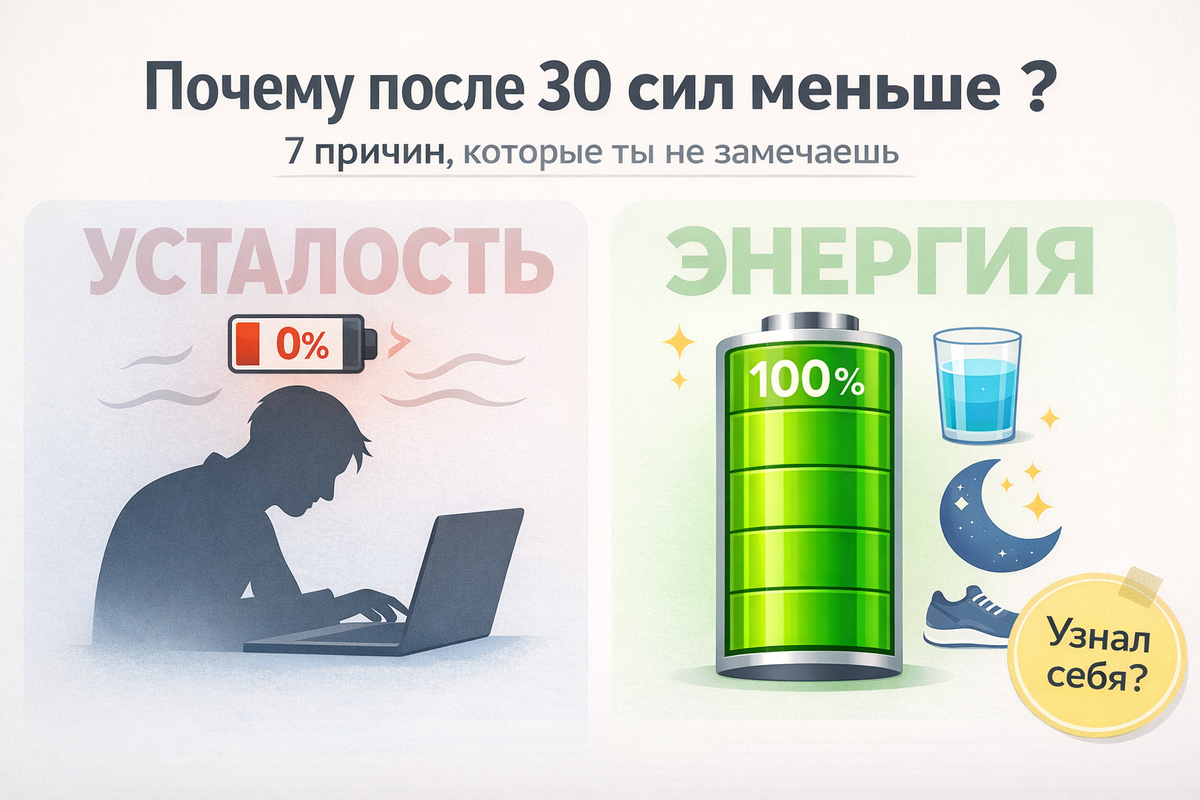 Ты не ленивый. И ты не “слабый”. Просто у большинства людей после 25–35 появляется странный режим: утром ещё держишься, а к 14–16 часам — будто батарейку вынули. В этот момент мы обычно делаем две ошибки: ругаем себя и заливаем кофе. Я дам 7 причин, которые чаще всего “крадут” энергию.