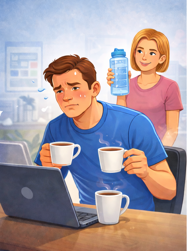 Всё началось с того, что жена купила себе бутылку с разметкой по часам — ну, знаете, такие, где написано «8:00 — доброе утро!», «10:00 — продолжай!», «12:00 — ты молодец!». И начала таскать её везде. Через неделю заявила что у неё кожа стала лучше и энергии больше. Я посмеялся. А потом задумался — а сколько воды я вообще пью за день? Один день честно записывал всё что пил. Утром — кофе, 250 мл. На работе — ещё два кофе. В обед — компот из бизнес-ланча. Вечером — чай. Всё. Чистой воды за день — ноль. Вообще ноль. Вся жидкость — это кофе, компот и чай. А кофе, как выяснилось, ещё и обезвоживает. Полез считать свою норму. Стандартная рекомендация — 30-35 мл на килограмм веса. При моих 86 кг это 2.6-3 литра. Я пил от силы литр, и тот в виде кофе. Купил литровую бутылку, поставил на рабочий стол. Цель — три бутылки в день. Первые три дня я жил в туалете. Серьёзно, вставал каждые сорок минут. Коллеги начали шутить. Ещё я постоянно чувствовал что живот раздутый — непривычно было столько жидк