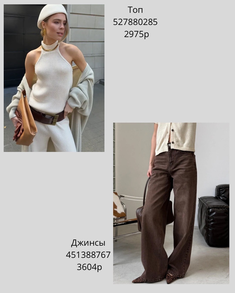 - Городской шик: джинсы 480611330 + куртка 727228045 + лаконичный верх (молочный или чёрный).